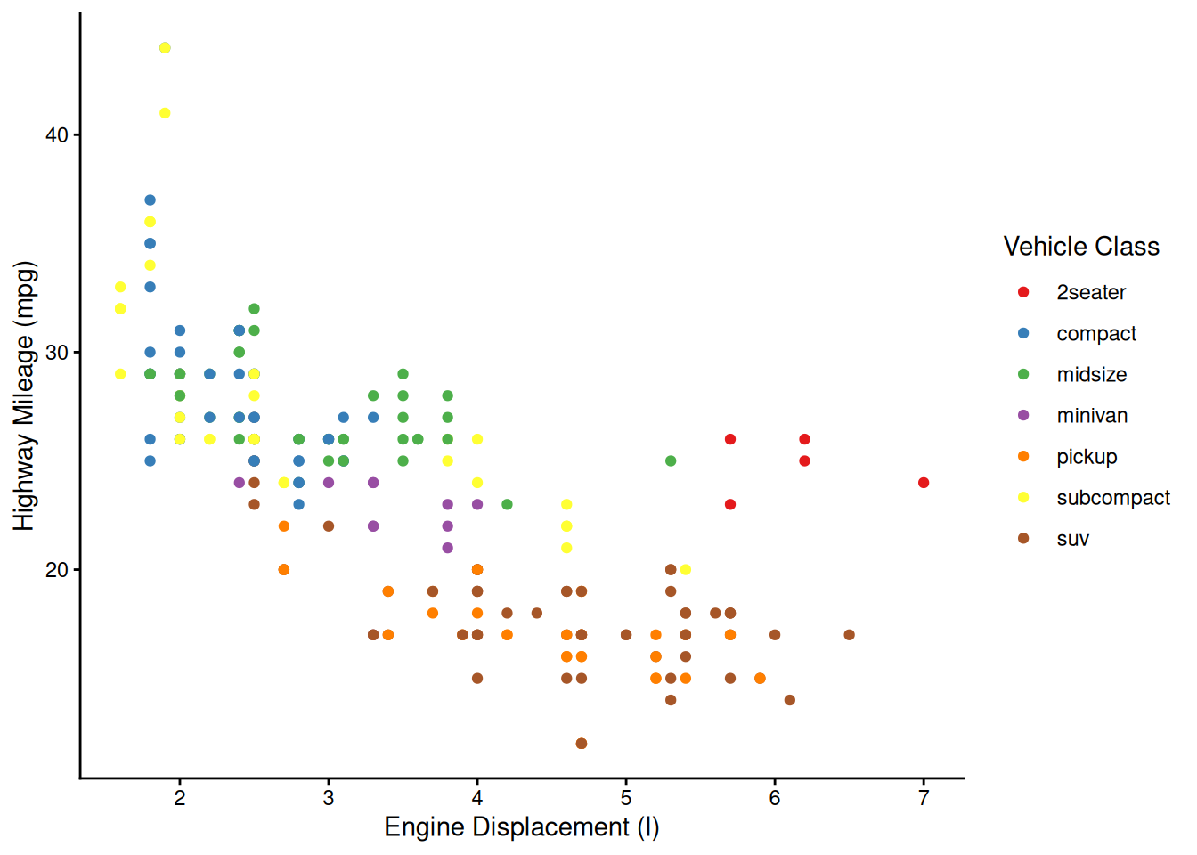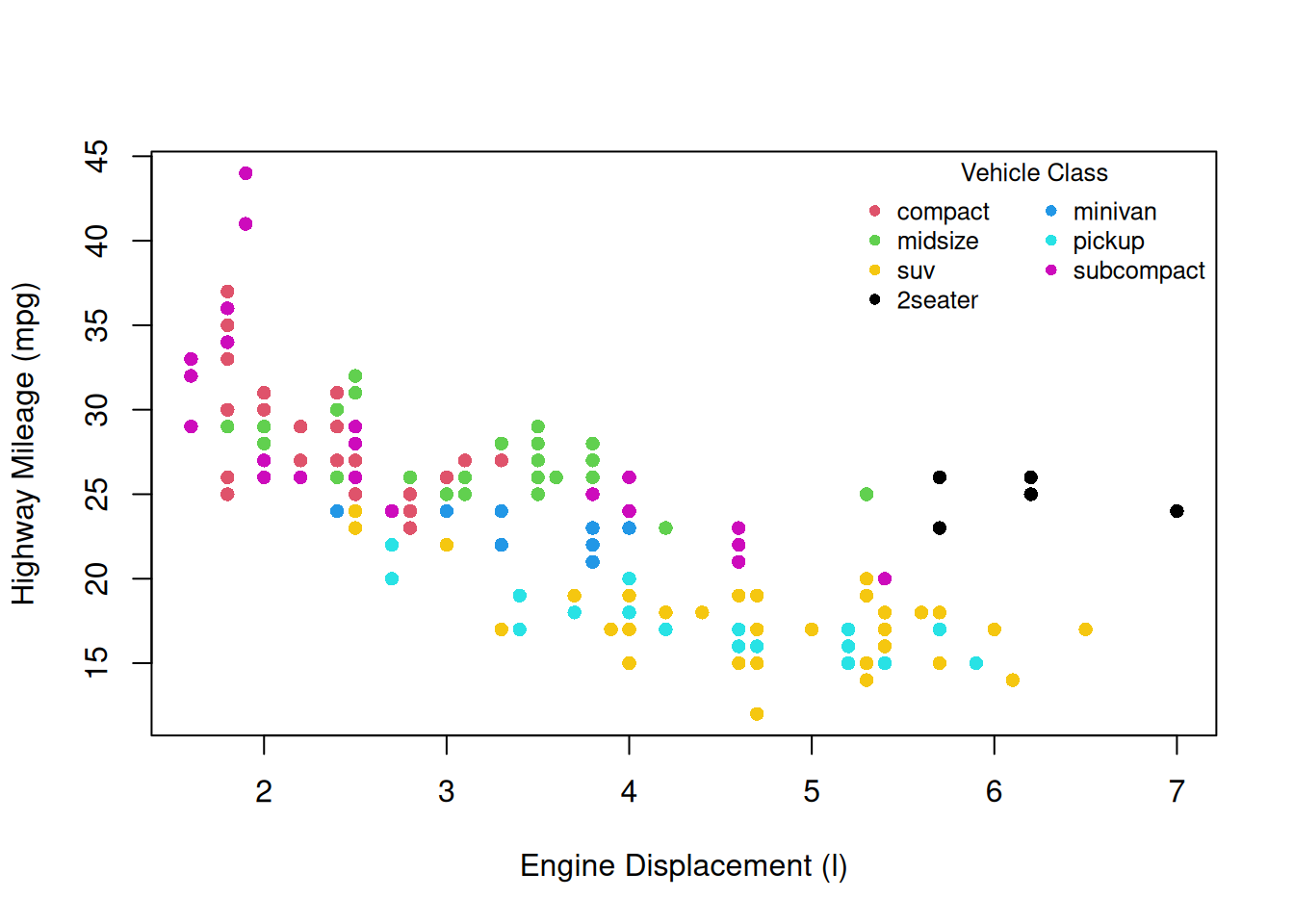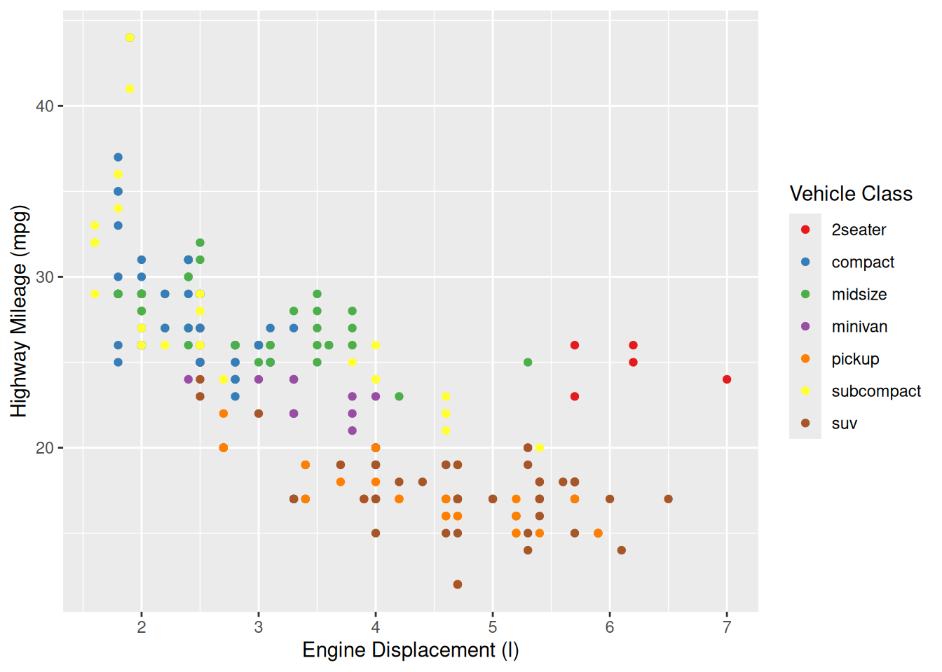 You’ll notice that with just a couple of lines, we’ve already made a pretty nice visualization. ggplot2 does most of the work for us once we specify our x and y variables. Let’s go a step further and color the points by another variable (e.g., the class of the car). With ggplot2, all that requires is specifying another aesthetic: