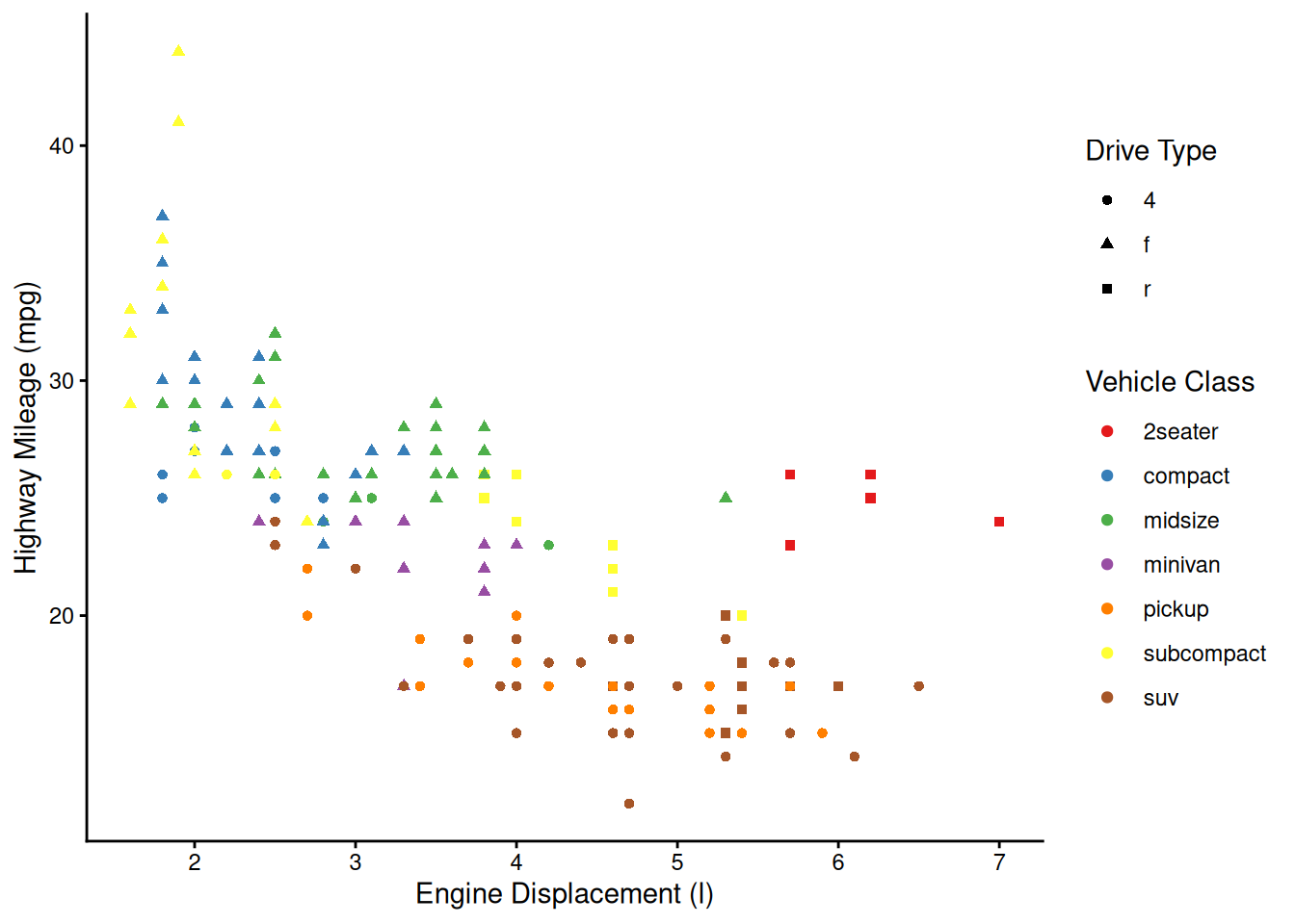 ggplot(mpg, aes(x = displ, y = hwy, color = class, shape = drv)) +