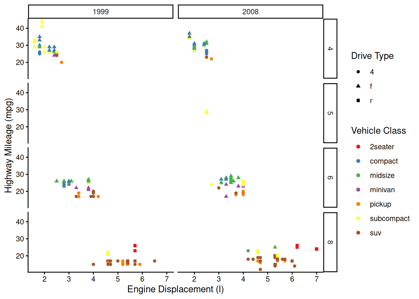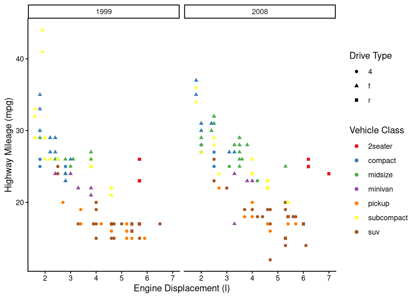 Now, what if we wanted to also split the data by the years the cars were manufactured? We’re already using color and shape, so what other aesthetic could we use? We could possible use some shapes that have both a fill and outline color, but that sounds messy. Instead of using another aesthetic, we could also use a facet. This splits the chart into multiple panels: