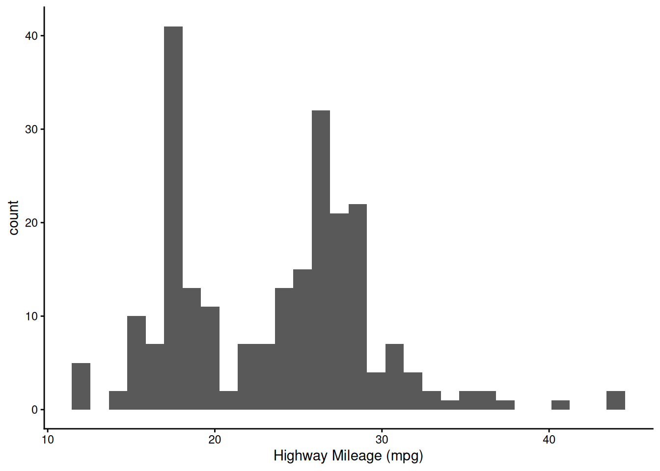Note how histograms don’t require a y-axis aesthetic by default. The counts are tabulated for you.