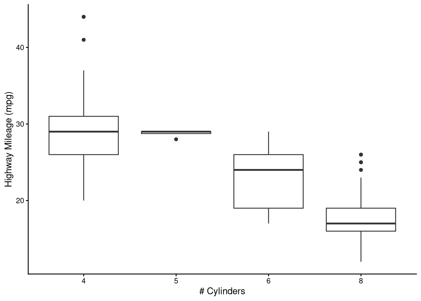 ggplot(mpg, aes(x = as.factor(cyl), y = hwy)) +