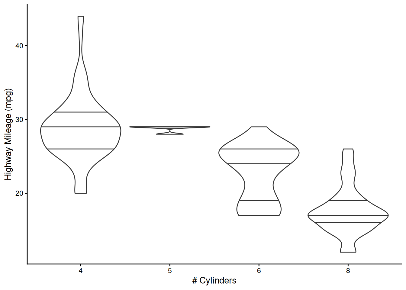 Note that many of these “geoms” have lots of options. For example, we’ve decided to scale all of the violin plots to the same width and to draw the quartiles on them (mimicking the boxplots above).