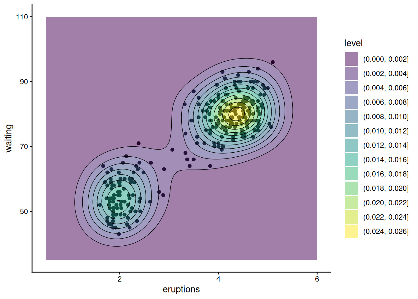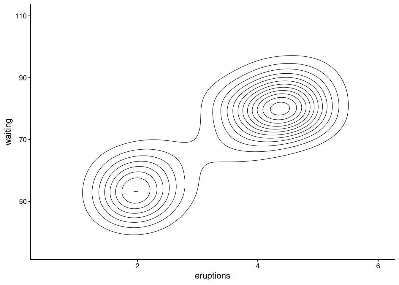 We can also visualize the density of values across two continuos variables using a 2D contour. Here we’ll use the built-in Old Faithful waiting time/eruption duration data (faithful). We’ll expand the axes a little bit to better show the contours: