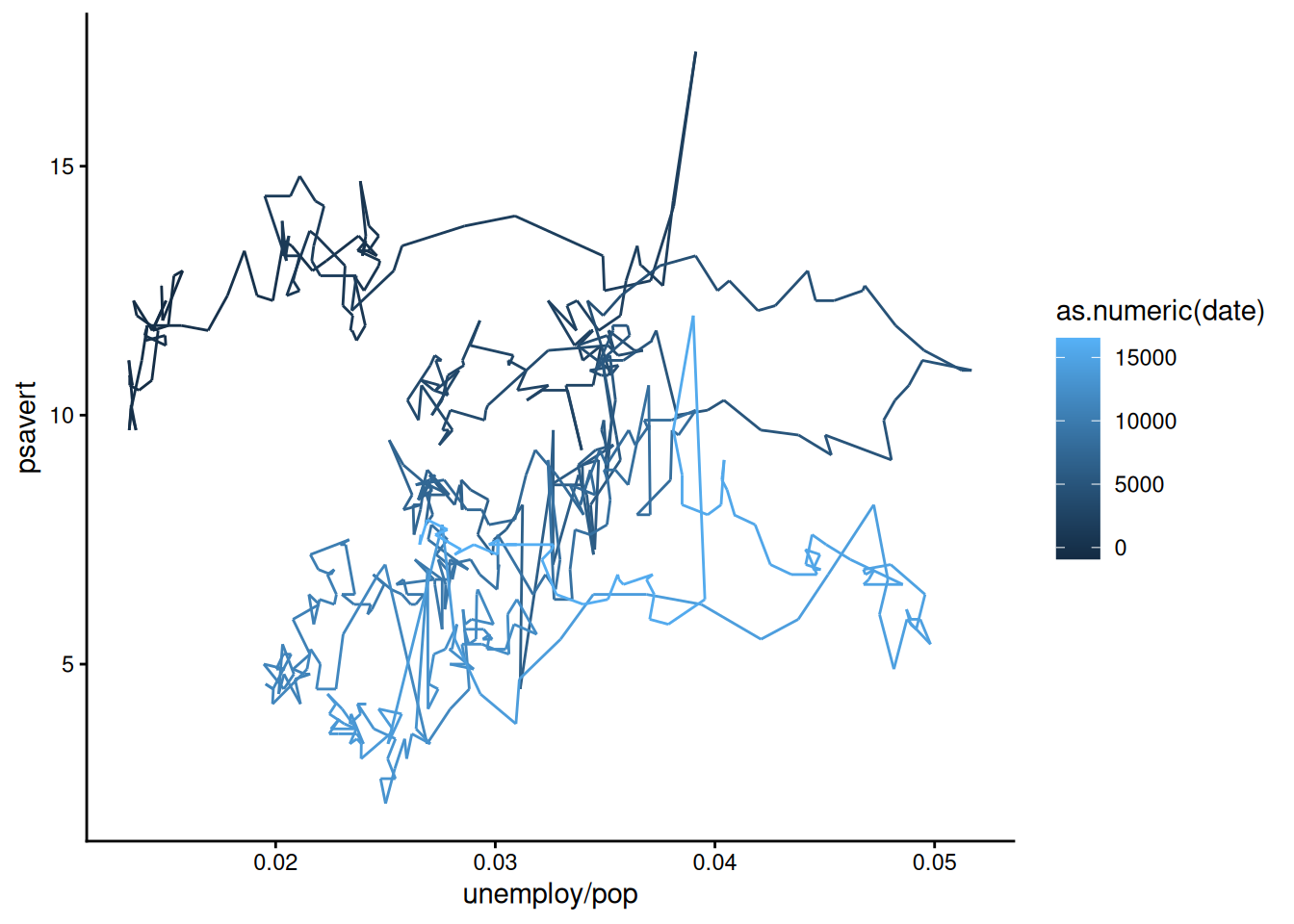 For comparison, here’s how we would produce a similar graph using only R’s built-in (base) plotting functions. It’s worth taking a moment to see how ggplot’s additive functions all work together to produce a final product, whereas base R requires lots of simultaneous arguments inside a single function, plus sequential additive functions that ggplot accounts for by default (e.g., adding a legend).