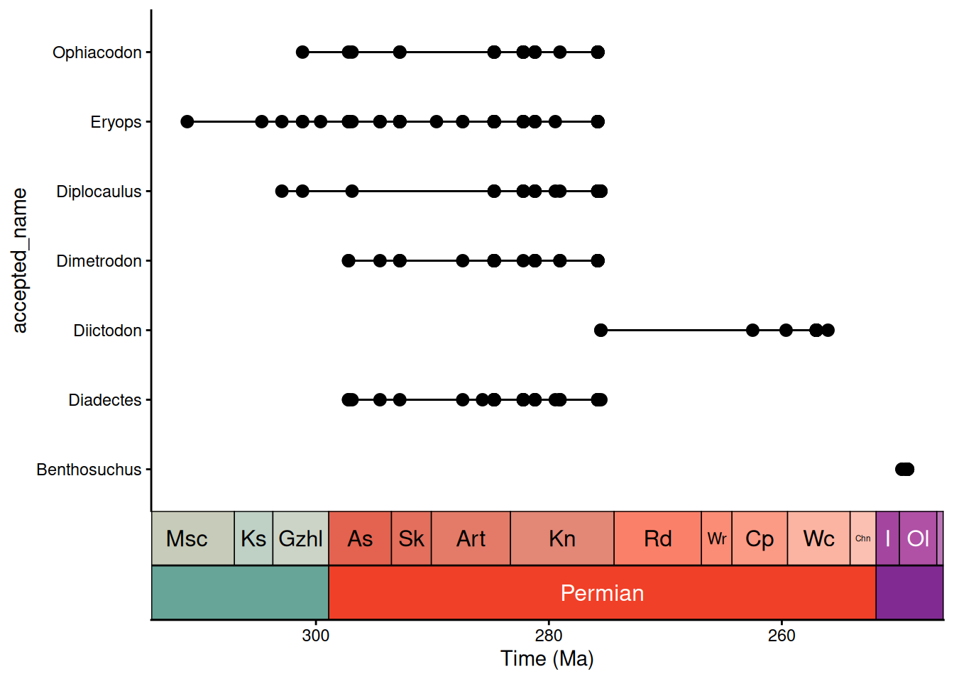 occdf <- subset(occdf, accepted_name %in% c("Eryops", "Dimetrodon",