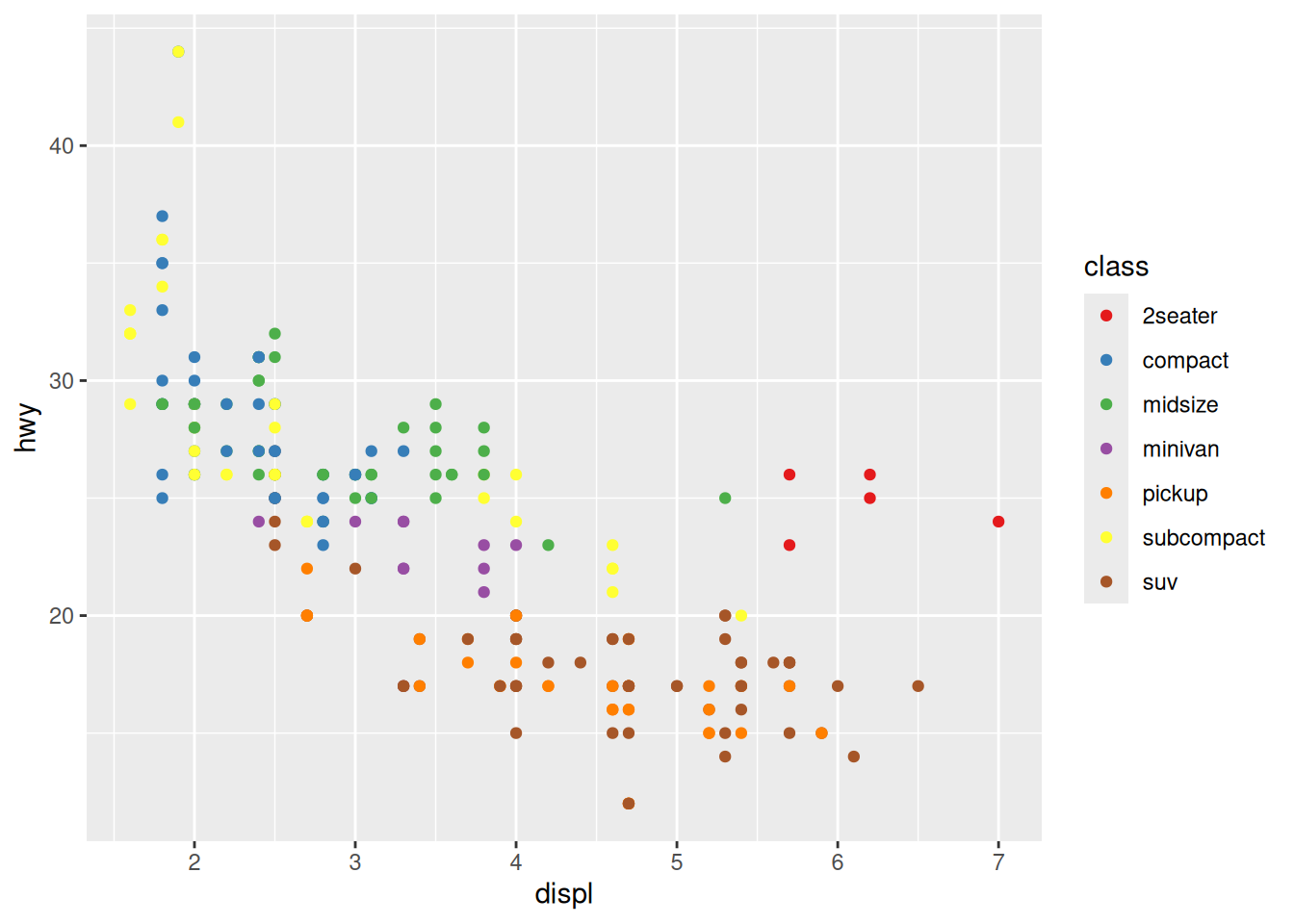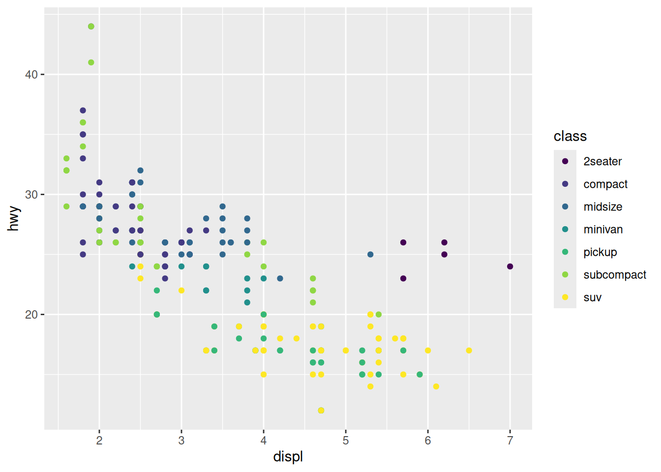 ggplot(mpg, aes(x = displ, y = hwy, color = class)) +